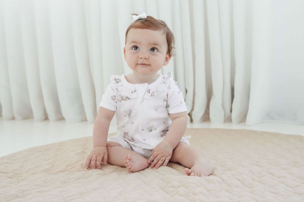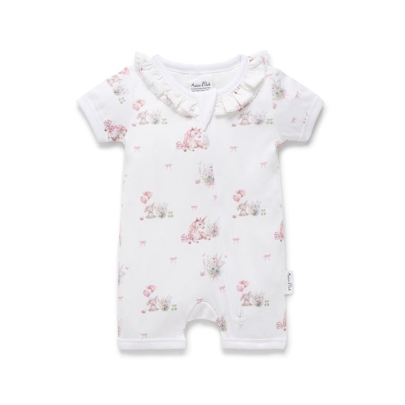 Made from GOTS certified organic cotton, this short sleeved zip romper has an all over print featuring unicorns, ruffle to neckline and premium two way zip with protective backing.