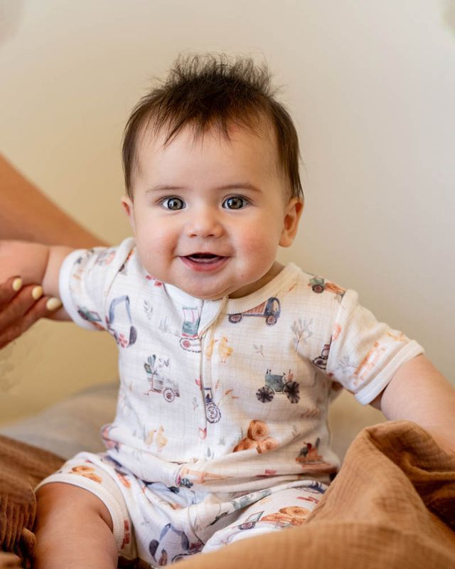 Perfect for little adventurers, our Farmyard Zip Romper is made from soft, breathable 100% organic cotton, designed with comfort and play in mind. Featuring a delightful farm-themed print, this short-sleeve romper is ideal for sunny days exploring or relaxing at home. The front zip allows for quick and easy changes, while the safety fold at the top ensures gentle protection for delicate skin.