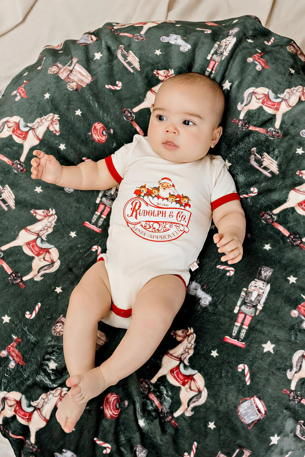 Step into Christmas cuteness with our limited-edition “Rudolph + Co. Santa Approved” Bodysuit 🎅🏼✨ Designed in the softest eggnog hue with festive red trim, this vintage-inspired style brings nostalgic charm with a modern twist.