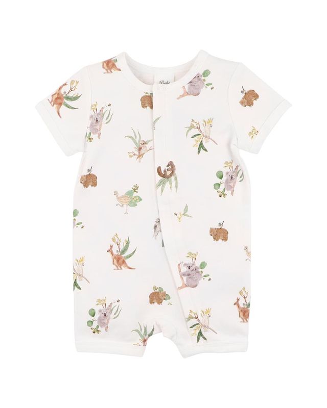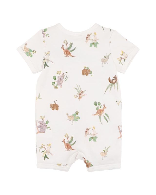 Perfect for warm-weather adventures and everyday play, this Organic Cotton Short Sleeve Zipsuit brings a touch of the wild with its adorable all-over print of Australia's favourite native animals. Featuring koalas, kangaroos, wombats and more, this playful piece celebrates Australian charm in the softest way. Crafted from breathable, natural Organic Cotton, it features a full-length front zip for quick changes, and a press stud at the neckline to keep the zip neatly in place. The short sleeves help keep little ones cool and comfortable, making it ideal for sunny days, playdates, or uniquely Australian gifting.