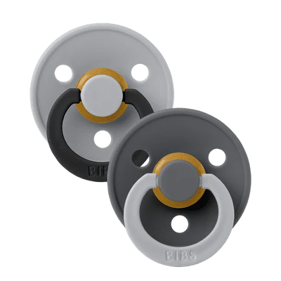 The Colour pacifier is the original BIBS pacifier and has been on the market for over 40 years. It has the signature round BIBS shield with three vent holes and round BIBS engraved handle ring.
