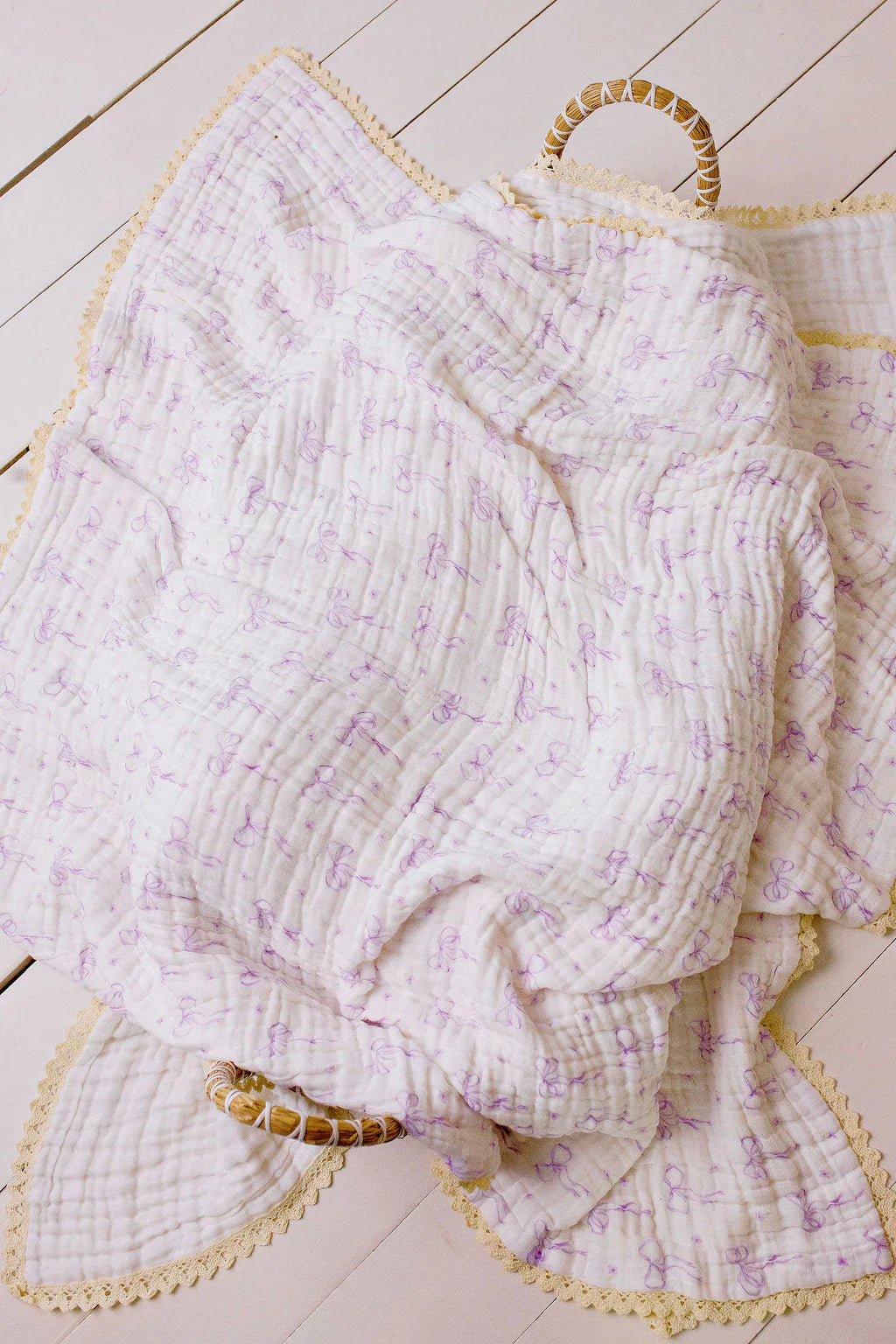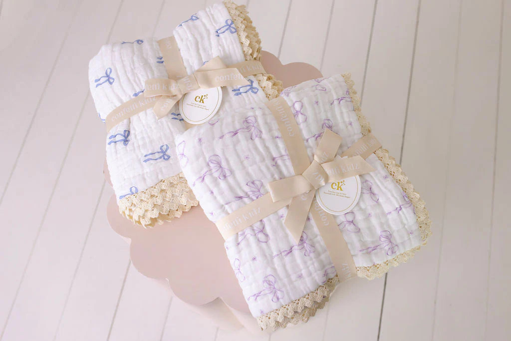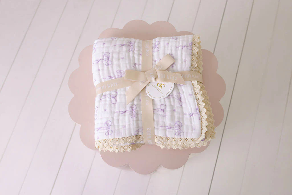 Confetti Kidz - Muslin Blanket with Lace Trim - Lilac Bows