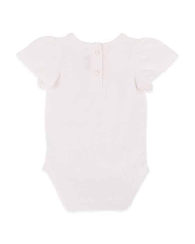 A little garden of blooms for your baby girl. This soft puff-sleeve bodysuit is adorned with three delicate embroidered flowers, adding a charming touch to a classic silhouette. Perfect for pairing with her Grow Wild bloomers or worn as a standalone outfit on warmer days.