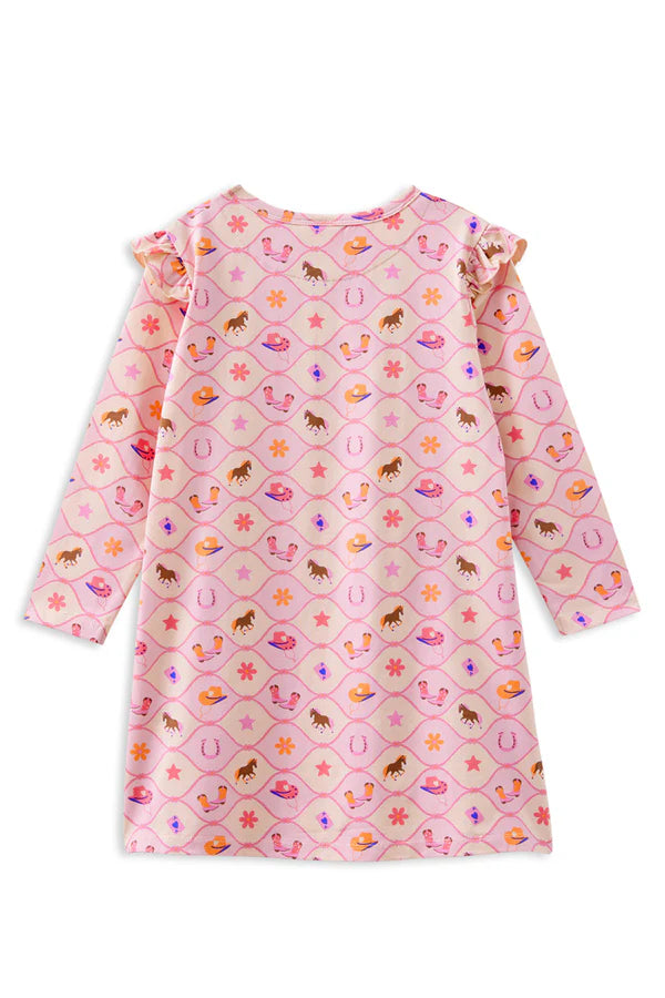 Milky Clothing Rodeo Dreams Nightie. Dream big and ride wild in Milky’s Rodeo Dreams Nightie! With cowboy boots, galloping ponies, lassos, and stars dancing across a soft pink base, this long-sleeve nightie is all about bedtime fun with a touch of country charm. The relaxed fit and breathable cotton blend keep things comfy from sunset stories to sunrise giggles. Match it with the Rodeo Dreams PJs or Zip Romper for an adorable family sleepwear roundup.