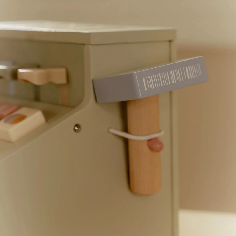 Calculate, scan, and pay up! With this wooden cash register, playing shop feels even more real. The register is equipped with a scanner, card reader, buttons, and a cash drawer for coins and bills. It also comes with a bank card, so customers can pay with cash or card. A fantastic way to playfully learn about money and numbers. What will you buy today?