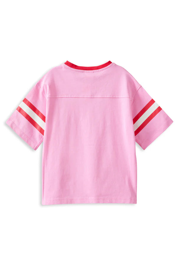 Milky Clothing New York Tee- Pink. Our New York Tee is an oversized hero with sporty sleeve stripes and bold New York City lettering that brings instant fun to everyday outfits. Made from 100% rugby cotton jersey this fabric is thicker than your average tee so it’s warm durable and ready for kids who live life at full speed. Also available in a blue colourway for an easy colour swap. With a relaxed oversized fit and a comfy drop-shoulder shape it’s made for effortless layering. Pair it with leggings bike shorts denim and trackies for a look that works for weekends, kinder days and everything in between.