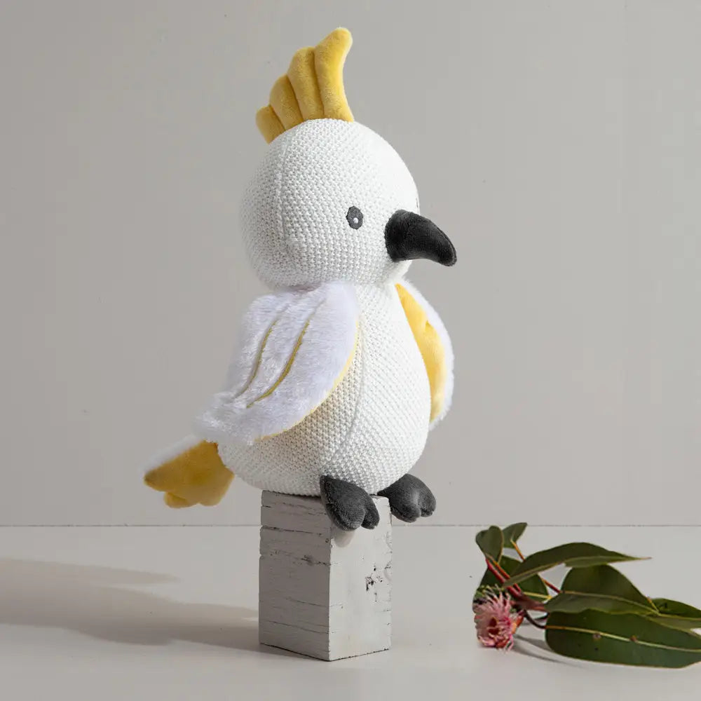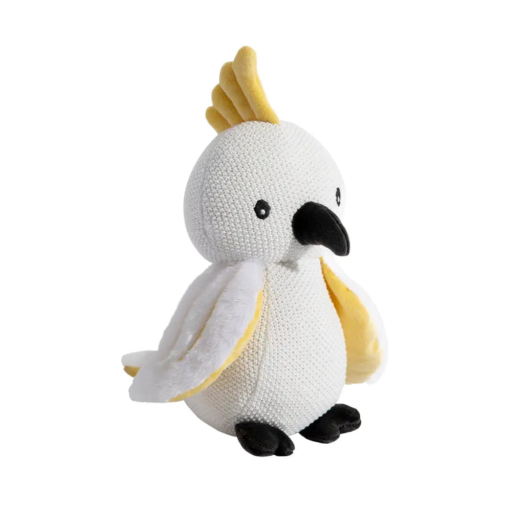 Delight little ones and parents with our charming Colin the Cockatoo Knitted Toy. Beautifully crafted from mostly cotton with a pearl knit finish, they offer a lovely handcrafted feel. Each features a gentle rattle for playtime and comes with a sweet name label - perfect for cuddles, keepsakes, or gifting.