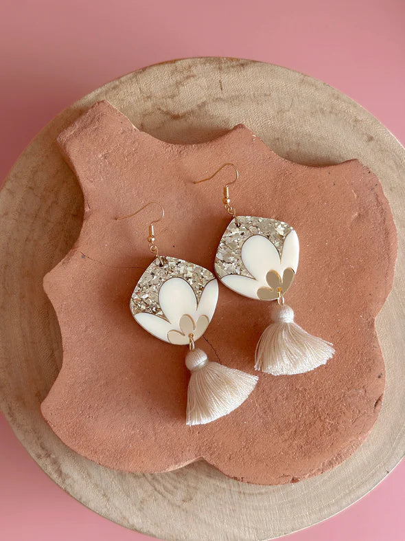 Featuring a hand-drawn floral motif in creamy ivory and glittering gold acrylic, these statement earrings bring major 70s disco energy with a touch of modern femininity. Finished with soft tassels that sway with every move, they’re made to dance the night (or day) away.