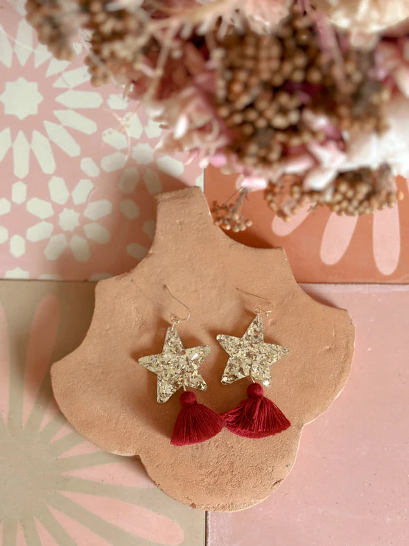Hand drawn star design made from beautiful gold sparkle acrylic with a merlot tassel on a surgical steel hypoallergenic hook.