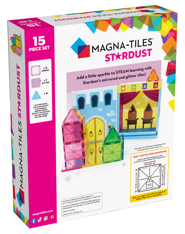 Everyone can use a little more glitter and shine in their life! With mirrored and glittered tiles, your child can add some sparkle to playtime with the Stardust set. This eye-catching has everything fans love about classic MAGNA-TILES pieces - but with a glitzy twist! This unique set includes vibrant, translucent tiles full of glitter and others with brilliant mirrors that catch the light just right. The extra shine is a great way to keep kids engaged as they create, have fun, and develop foundational skills in STEAM areas and beyond.